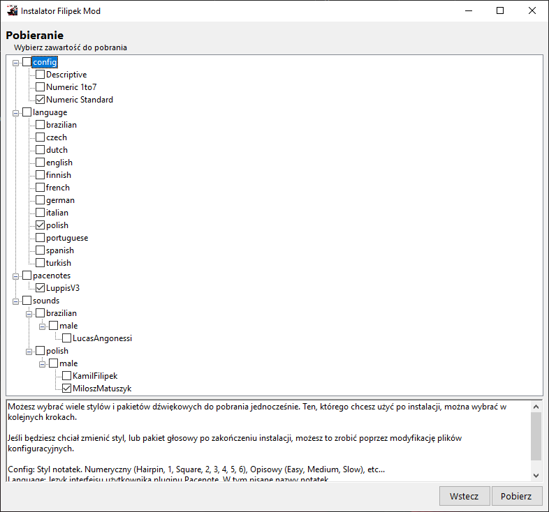 Na czwartym ekranie, wybierzecie zawartość która zostanie pobrana na wasz komputer. Nie jest to wybór finalnej konfiguracji! Jeżeli chcecie w przyszłości przetestować inne konfiguracje, pilotów, etc. możecie ich pobrać i przełączam się między nimi, poprzez zmiany w plikach konfiguracyjnych